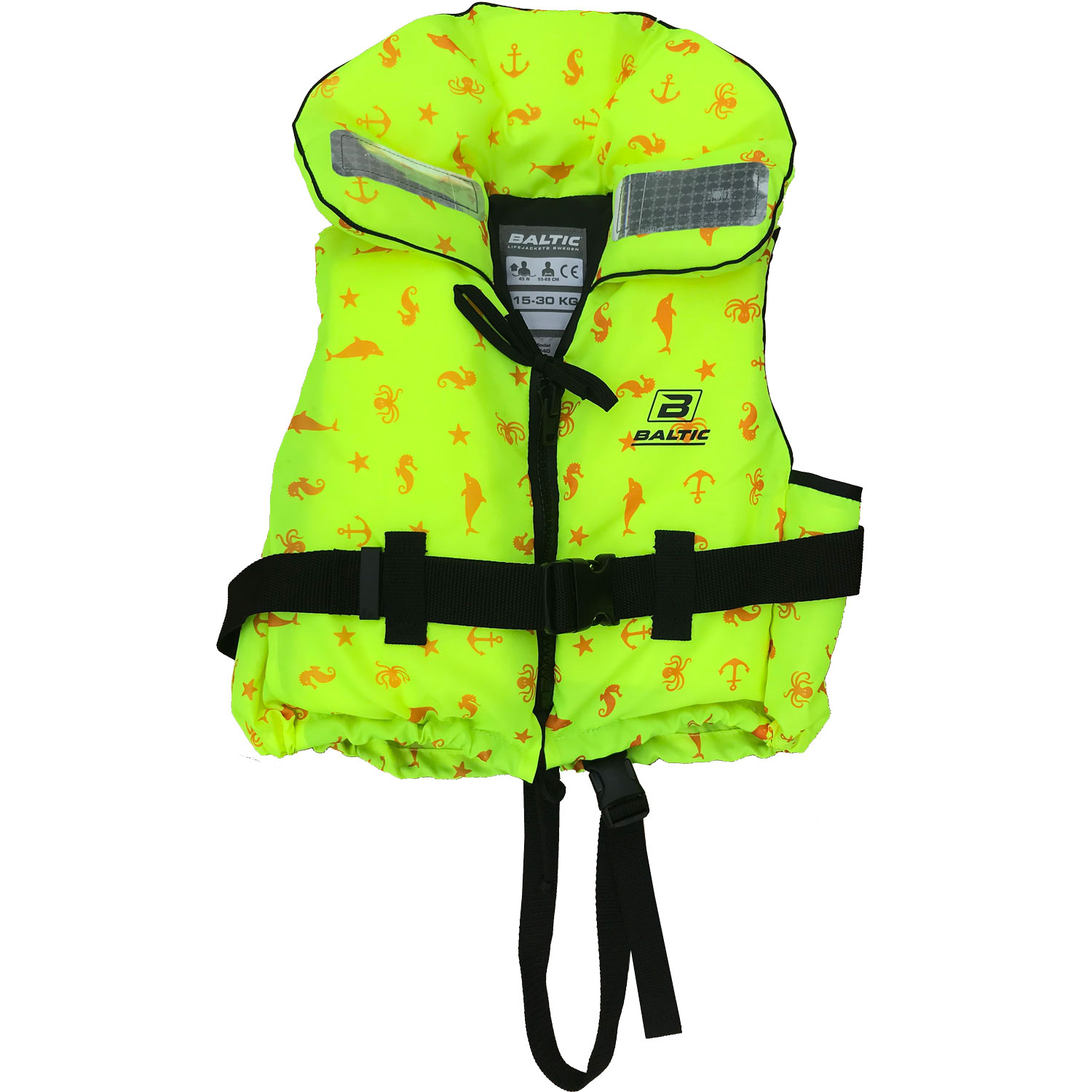 A classic lifejacket in durable high visibility fabric fitted with retro-reflective patches, front zip, adjustable waistband, crutch strap, top and bottom ties, whistle, lifting handle behind the collar (15–30kg only).