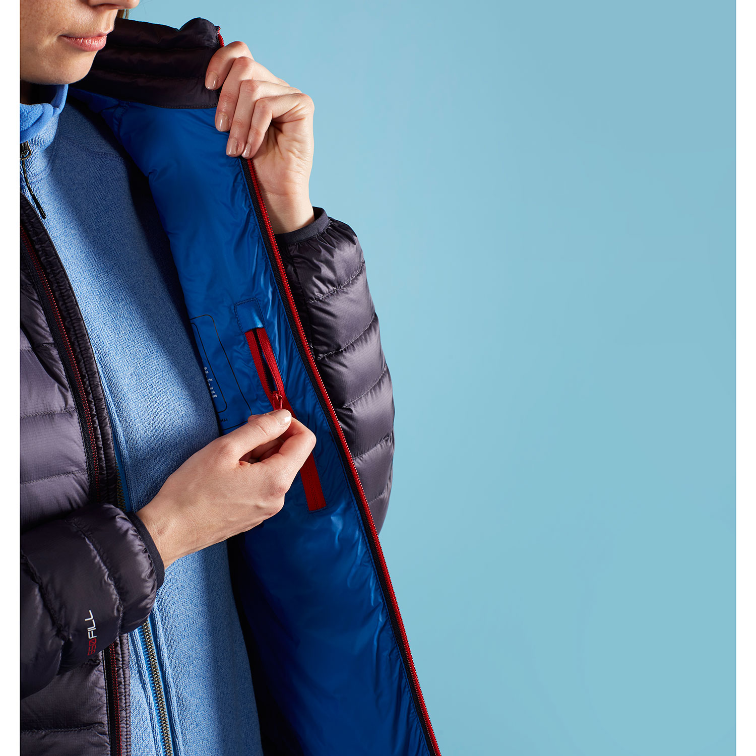 • Hydrophobic water-repellent down insulation.