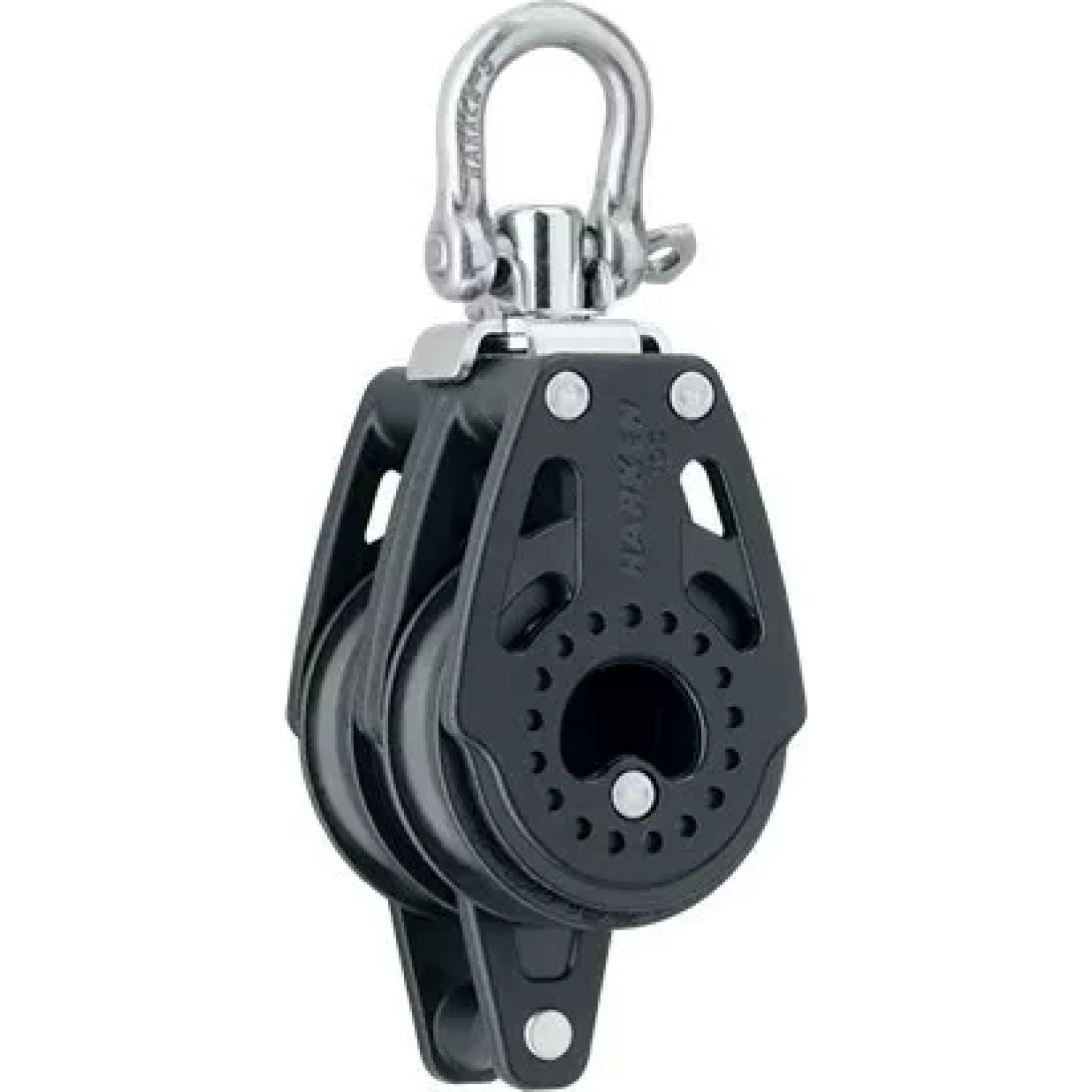 The double sheave configuration provides increased mechanical advantage, making it ideal for control lines and purchase systems where extra power is required. The swivel head ensures optimal alignment under changing loads, reducing friction and improving trimming efficiency, while the integrated becket allows for additional purchase setups and versatile rigging options.