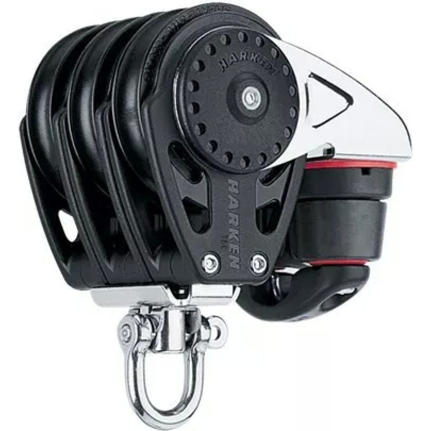 Harken 75mm Triple Block — Swivel, Cam Cleat is a high-power, all-in-one solution designed for demanding control systems where maximum purchase and secure line handling are essential. Combining a triple sheave block with an integrated cam cleat, this setup delivers efficient load management with quick, reliable line locking.