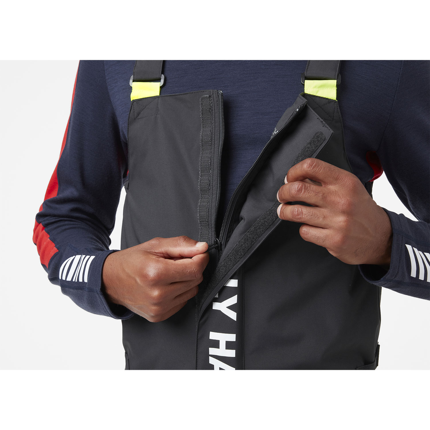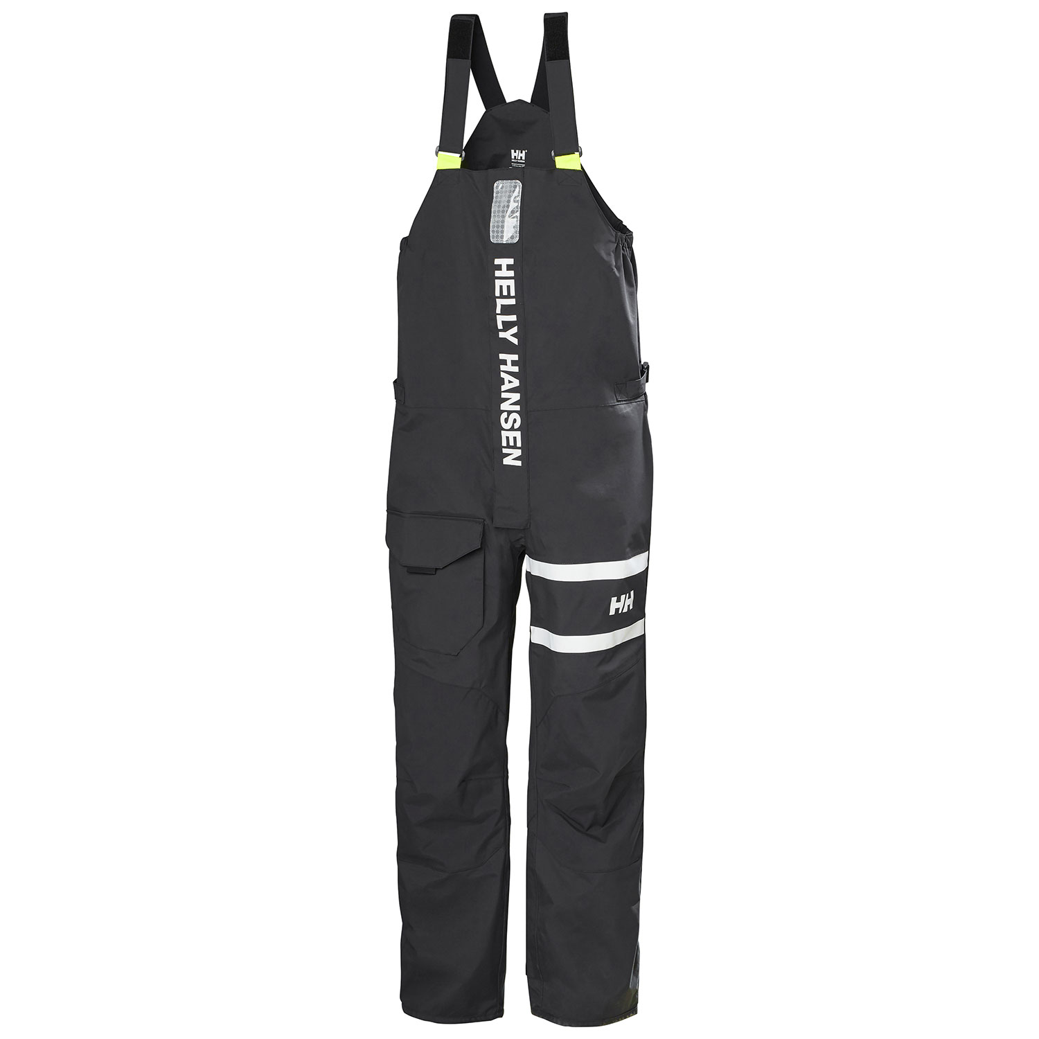 Fully featured bib or high trousers for coastal sailing. Designed based on the iconic Helly hansen flag stripe first used in the sailing jackets made for the Norwegian 1981 Withbread around the world entry "Berge Viking". The Salt Coastal Bib is a pair of modern sailing trousers made from waterproof and breathable HELLYTECH® and has the key coastal trouser features with heavy seat and knee reiforcement, front entry zipper with stormflap and inside gusset, and solas rated reflective.