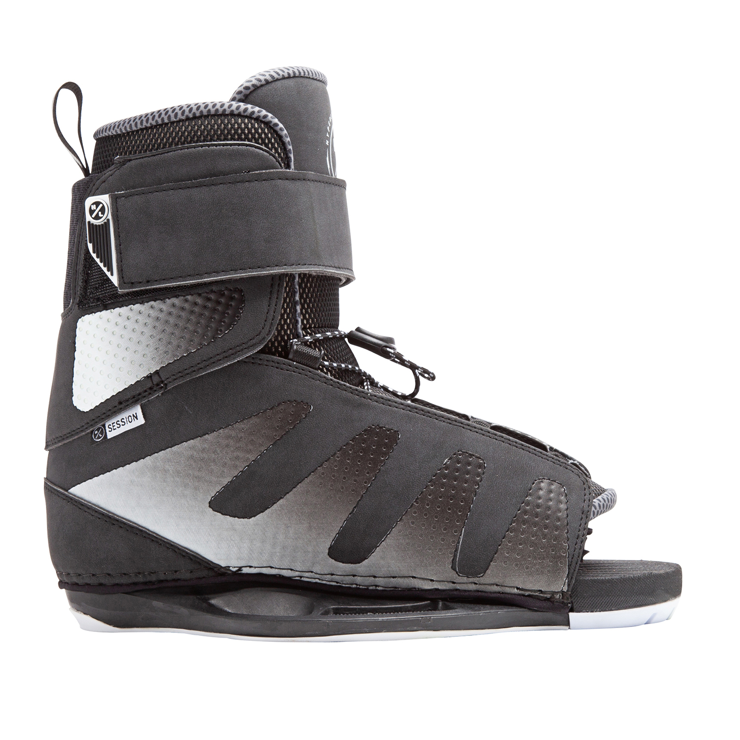 The Session Binding offers riders more adjustability with the open toe design. The Upper Ankle Hook & Loop Closure delivers that support riders crave and two lace zones means you customize the feel and support to your liking. Ideal for sharing or tailoring to meet individual needs, the Session Binding is the key to your season. Mount this binding to any Wakeboard, preferably an awesome Hyperlite, with our universal mounting system.