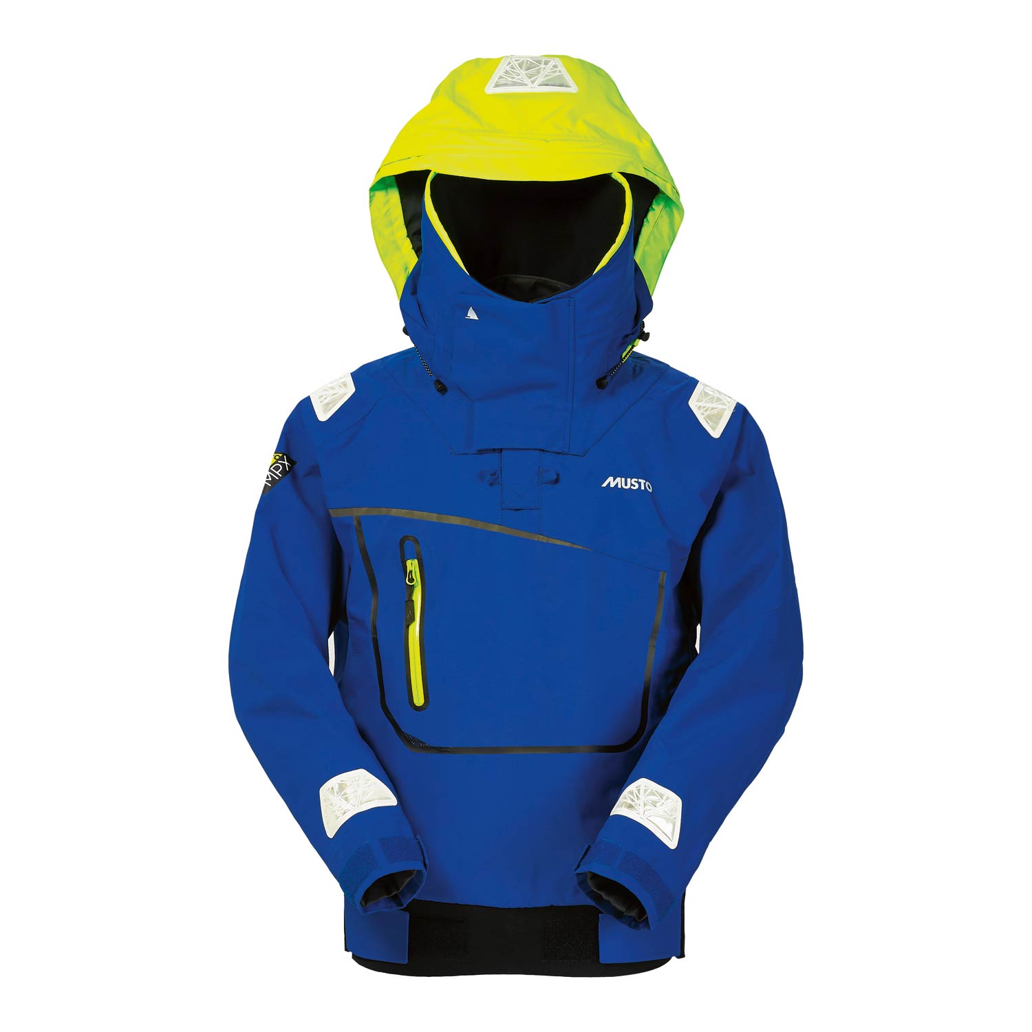 The ideal smock for offshore racing, this sporty asymmetrical design is constructed of a 3-layer GORE-TEX® PRO laminate exclusive to MUSTO for a truly weatherproof and hardwearing piece of kit. The comfortable band of elastic at the neck with VELCRO® adjustment is protected by the high, fleece-lined outer collar, to keep you dry. Adjustable cuffs and neoprene hem ensure a good fit. Keep your hands warm in the fleece-lined pouch pocket and your essential equipment close in the chest stash pocket. Photoluminescent reflectors and reflective print on the front and rear ensure you are visible even in low light for sailing day and night.