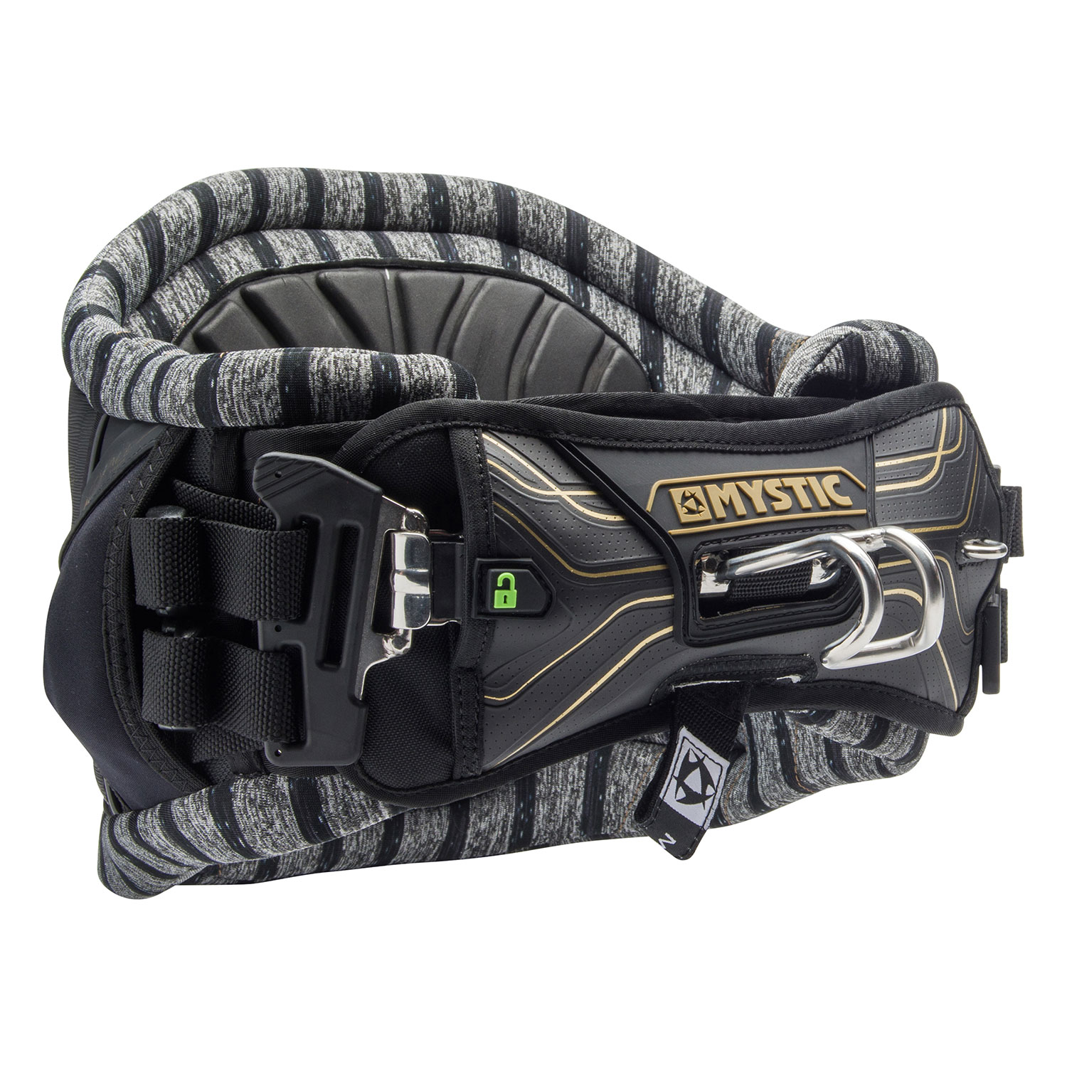 The side parts of the harness are covered to prevent unwanted releases. The covering also provides a place for the remaining webbing strap to fold into.