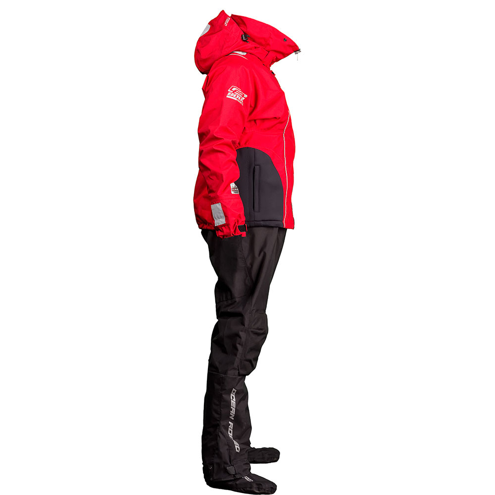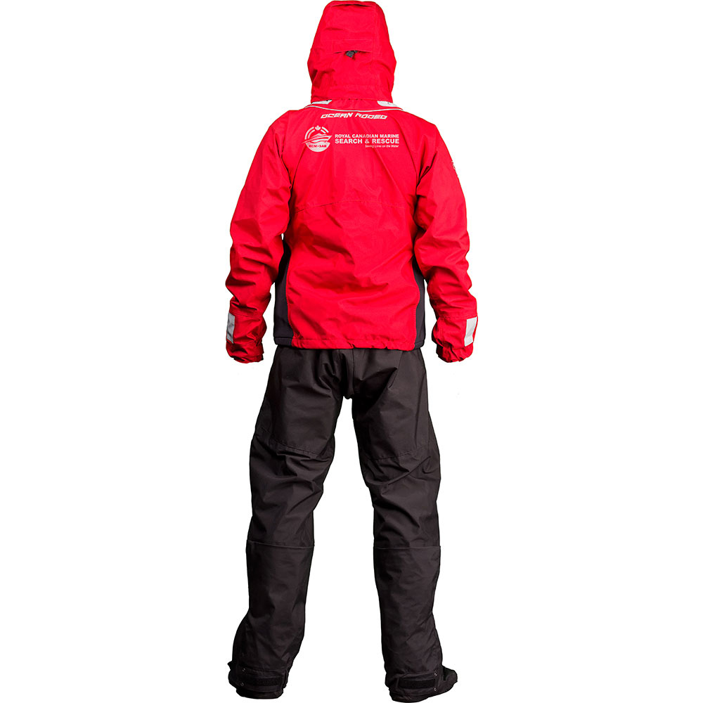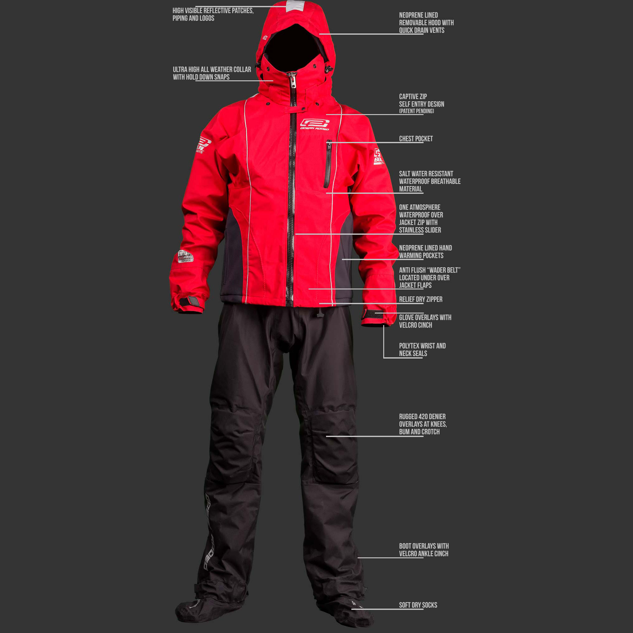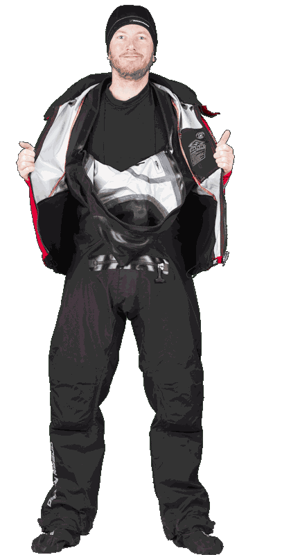 As added security we’ve added a “wader” belt at the waist to restrict water entry into the lower suit due to accidental submersion when worn in standby mode and added highly reflective patches and inks to the outside of the suit.