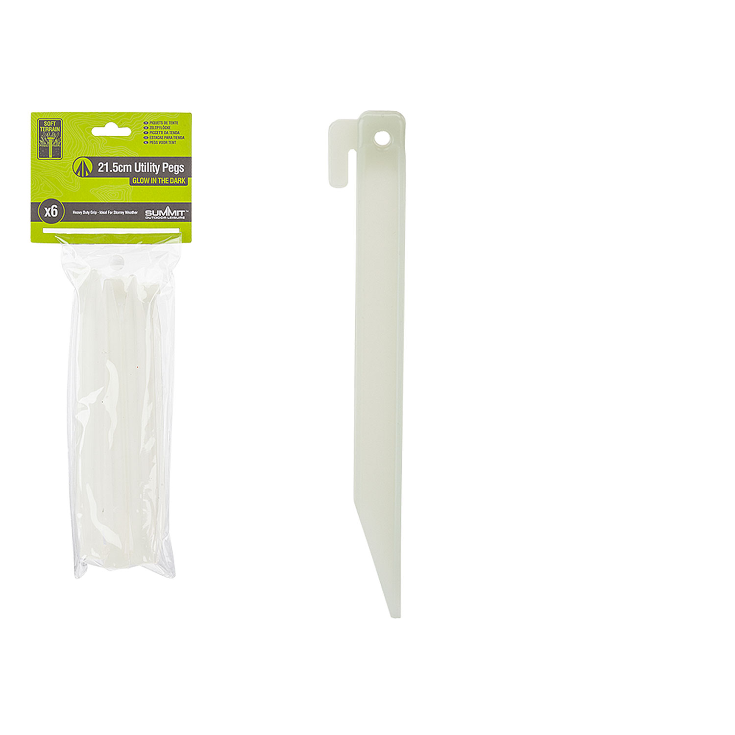 Essential 6 pack of power tent pegs. Featuring glow in the dark as a safety feature to avoid accidents in the dark